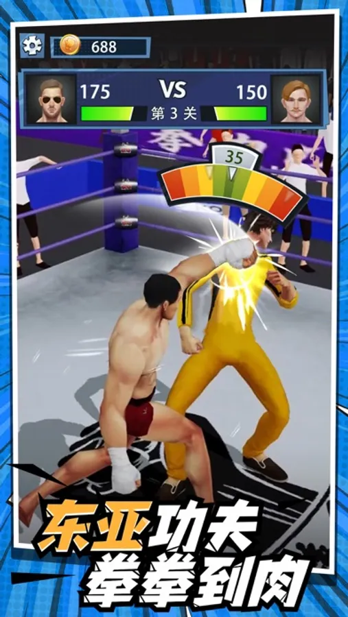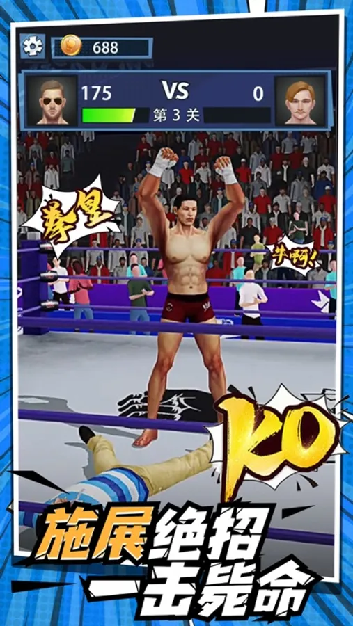 这是一款魔性搞笑拳击游戏,场景真实,皮肤酷炫。只需要你不停的升级力量和生命,就能挖掘潜能,发挥出拳头的真正实力!在关键时刻,一记致命抱摔,将敌人击飞出场!