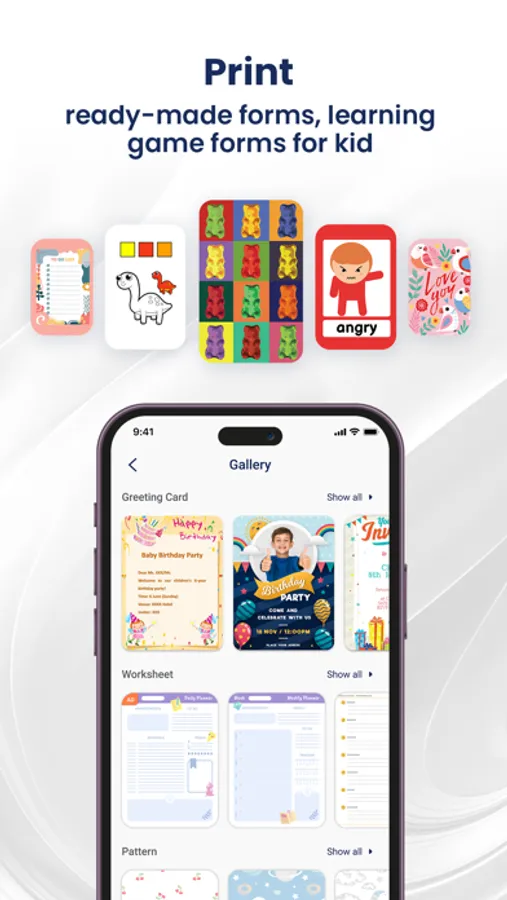 The app has more than 100++ printable templates with many category as Greeting Cards, Kids & Ads, Letter, Worksheet, Gamecard, Pattern.