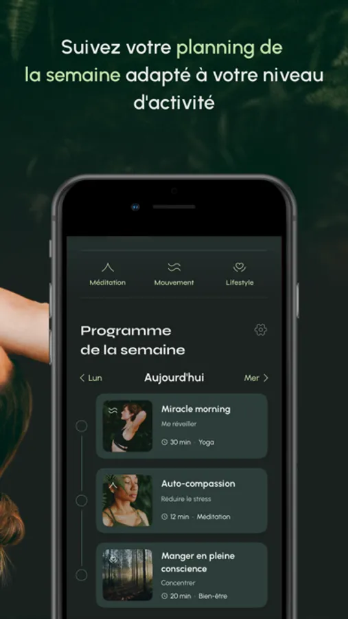 Une des grandes fonctionnalités de cette application est les plannings hebdomadaires de mouvement, méditation et lifestyle, pensés comme un calendrier pour ne plus avoir à choisir. Répondez au questionnaire et laissez vous guider par les choix proposés.