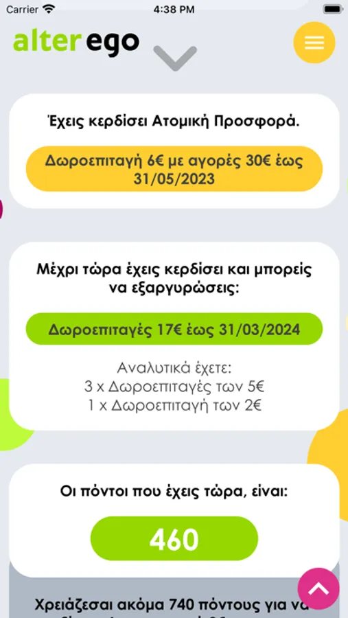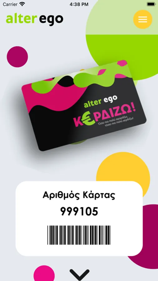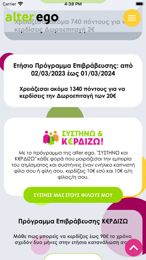 Με το νέο alter ego app έχεις ότι χρειάζεται να ξέρεις για να κερδίζεις στα χέρια σου. Πλέον έχεις στο κινητό σου την alter ego bonus card και μπορείς να βλέπεις εύκολα και γρήγορα τους συνολικούς πόντους που έχεις, τους πόντους που υπολείπονται για να κερδίσεις δωροεπιταγές και τις δωροεπιταγές που έχεις και μπορείς να εξαργυρώσεις. Επίσης θα μπορείς να βλέπεις τους πόντους που χρειάζεσαι για την ετήσια δωροεπιταγή των 20€, 35€ και 50€. Οι πόντοι σου ανανεώνονται αυτόματα με κάθε σου συναλλαγή στα καταστήματα alter ego. Επιπλέον με 3 απλά βήματα μπορείς να συστήσεις έναν ενήλικο καπνιστή φίλο σου θες και να κερδίσετε ο καθένας από 10€ κάνοντας τις αγορές σας. Όσους περισσότερους φίλους σου συστήνεις τόσο περισσότερο κερδίζεις.