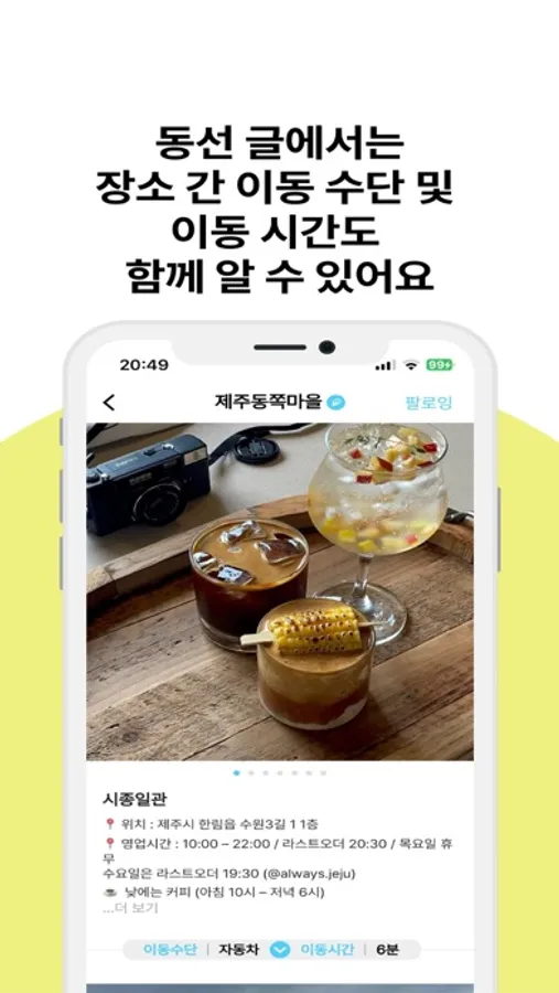 동선 글에서는 장소 간 이동 수단 및 소요 시간도 함께 알 수 있습니다.