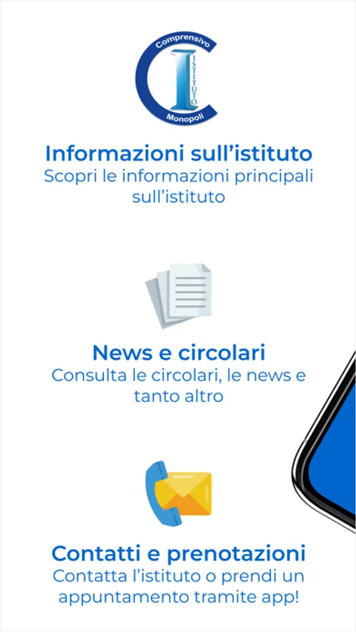 Scopri l'app dell'Istituto Comprensivo Vito Intini di Monopoli. Potrai visualizzare tutte le informazioni e i contatti dell'istituto, consultare i contenuti, ricevere notifiche push in base al tuo ruolo e ai tuoi interessi, accedere allo sportello digitale e prenotare un appuntamento con la segreteria o la presidenza.