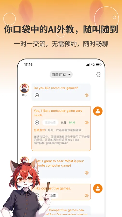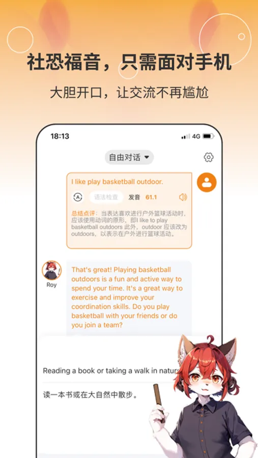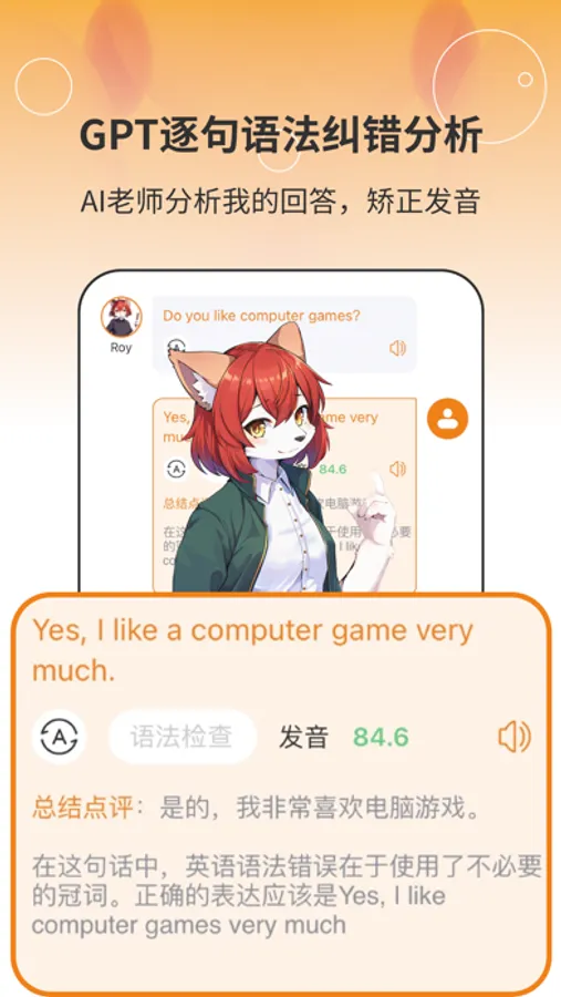 除了直接与AI老师的对话功能,我们还为同学们提供简单易学的跟读功能,为你提供全方位多元化的学习方式,我们还用到了先进的AI打分,对你的发音给到正确的纠正。
