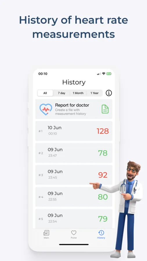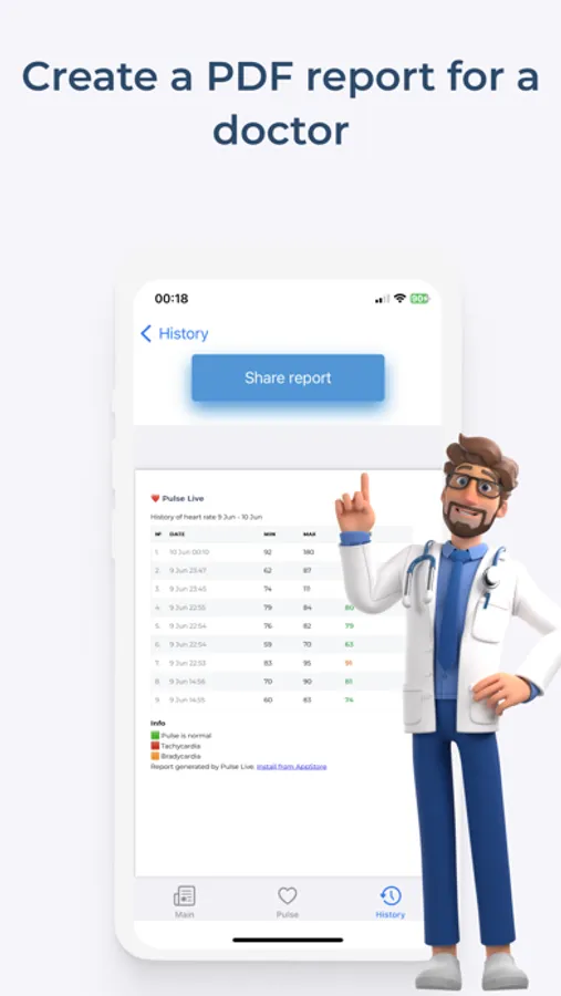 7. Instant heart rate measurement. Share the test results with your doctor. Create a PDF file with a report of the selected heart rate measurement period.
