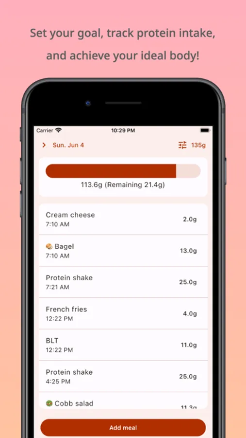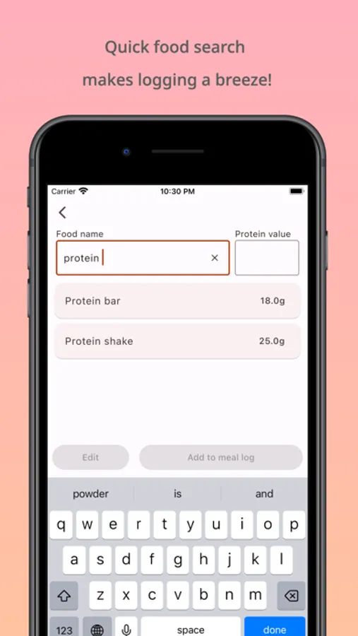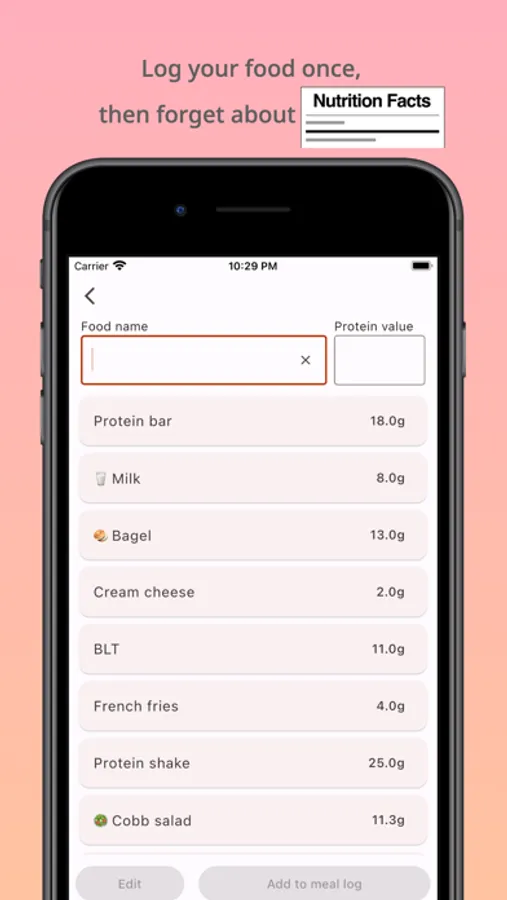 Log your meals by inputting the food name and its protein value. As you log your meal, the food is automatically saved to your food list.