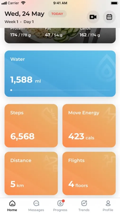 The app integrates with Apple Health to show your daily activity - distance, steps, active energy, and flights to help you better achieve your goals.