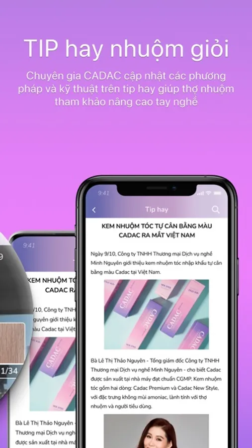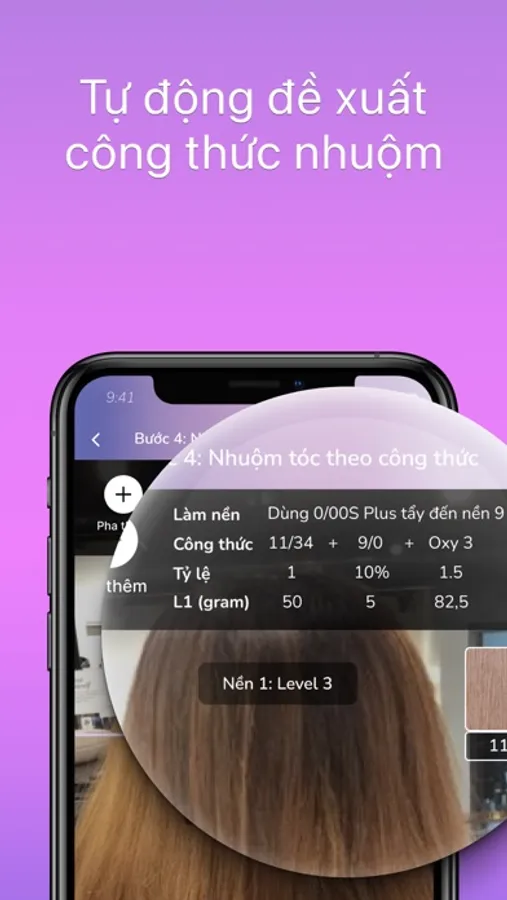 + TỰ ĐỘNG ĐỀ XUẤT CÔNG THỨC NHUỘM: Dựa vào mẫu tóc cần nhuộm và tình trạng tóc, siêu ứng dụng CADAC đề xuất công thức nhuộm tóc và các bước thực hiện để nhuộm tóc chuẩn màu mục tiêu.