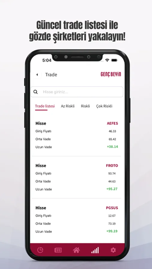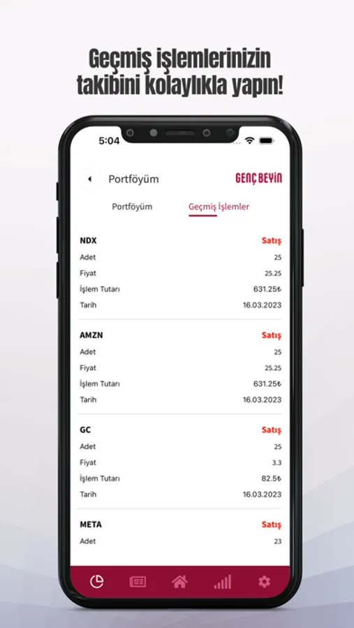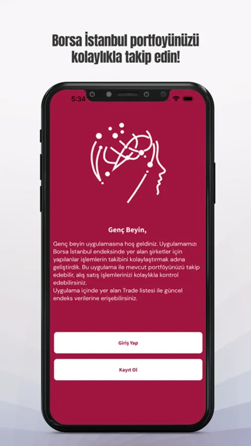 Genç beyin uygulamasına hoş geldiniz. Uygulamamızı Borsa İstanbul endeksinde yer alan şirketler için yapılanlar işlemlerin takibini kolaylaştırmak adına geliştirdik. Bu uygulama ile mevcut portföyünüzü takip edebilir, alış satış işlemlerinizi kolaylıkla kontrol edebilirsiniz.