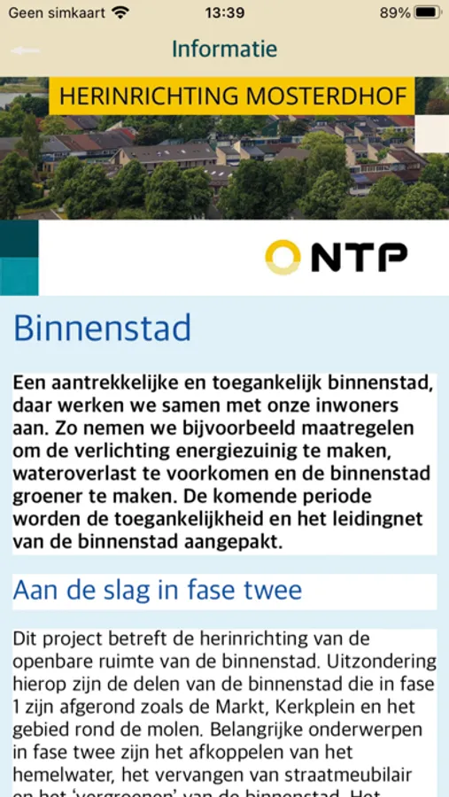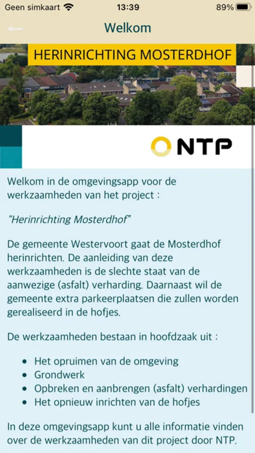 In deze app vindt u alle informatie over de werkzaamheden van het project Herinrichting Mosterdhof te Westervoort. Er wordt belangrijke projectinformatie, de laatste planning en contactinformatie weergegeven. Ook kunt u op deze app vragen, opmerkingen of klachten achterlaten die betrekking hebben op het project.