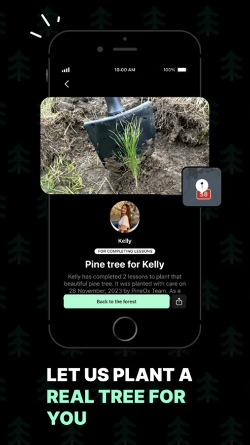 By completing 2 lessons you water your digital seed to a tree. And the PineOx team plants a real tree.