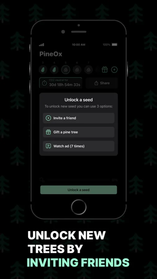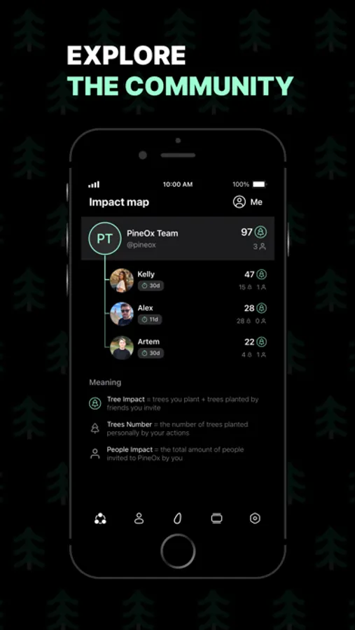 Every user of PineOx has Tree Impact. Tree impact represents planted trees. It includes trees planted by you plus trees planted by friends you invited and subsequently by friends invited by your friends.