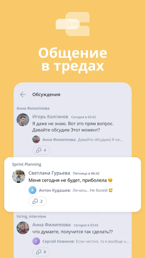 - Общайтесь в тредах и разделяйте общение на отдельные темы;