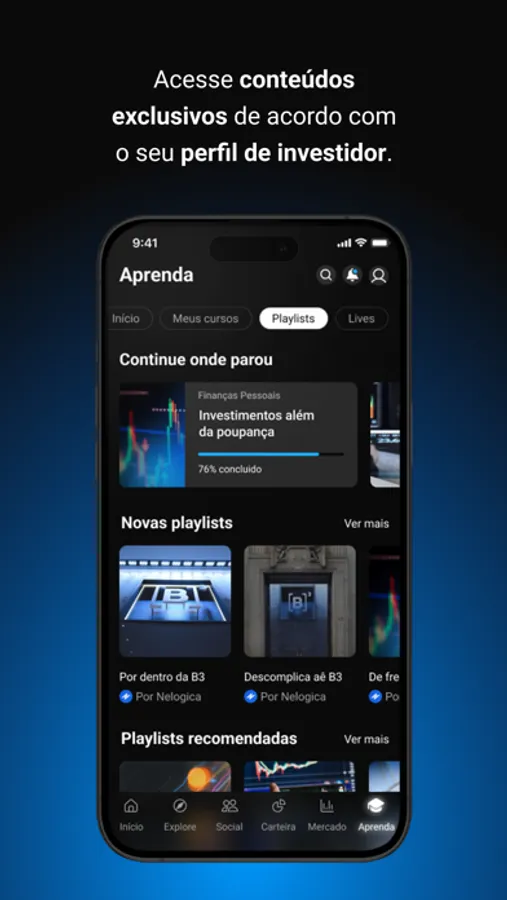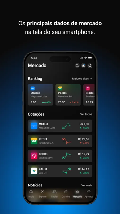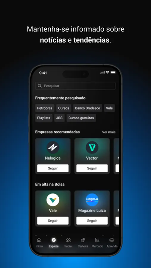 Oferecemos uma experiência única, combinando ferramentas de controle de investimentos, redes sociais, notícias e análises do mercado financeiro em um único aplicativo completo e fácil de usar.