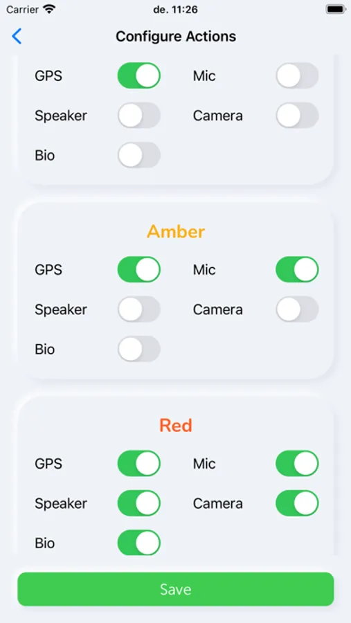 The color-coded, 3-buttons (green, amber and red) represent equivalent levels of emergency, allowing users to share location, audio, video, and user bio in real-time (seconds not minutes). Additionally, one can opt in to share vital data through health sensors.