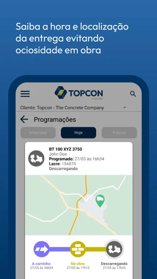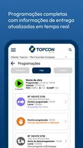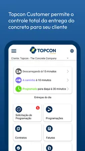 Através de uma interface simples e intuitiva, o TOPCON CUSTOMER permite gerenciar a entrega do concreto com indicadores de solicitação de programação, situação de cada entrega, laudos e tecnologia do concreto, pagamentos e situações de faturas, permitindo assim a tomada de decisões e evitando ociosidade no processo logístico.