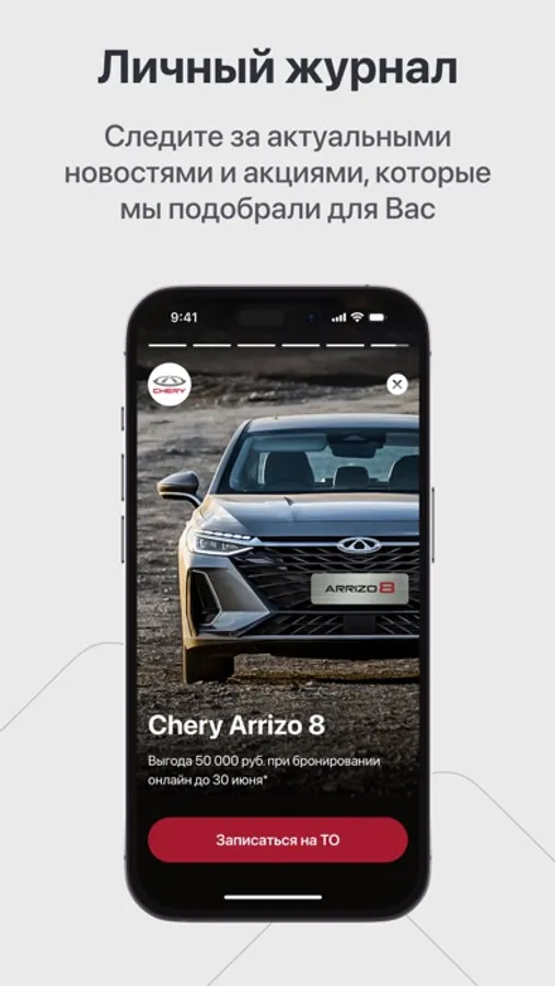 В приложение для Вас попадают индивидуальные выгодные предложения и акции от официального дилерского центра CHERY.