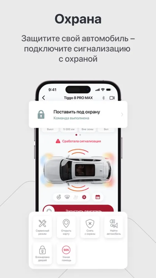 При проникновении в автомобиль, увозе на эвакуаторе или при ДТП мобильное приложение пришлет уведомление.