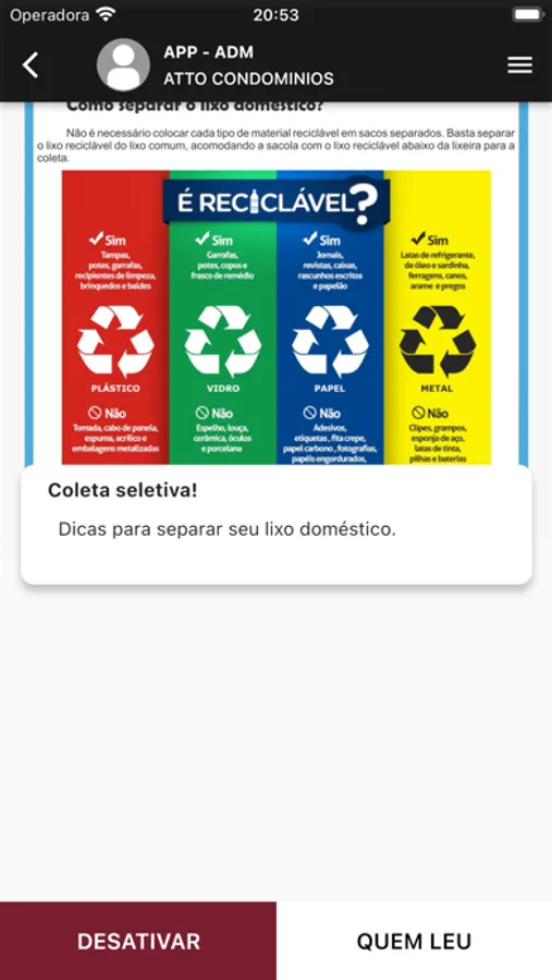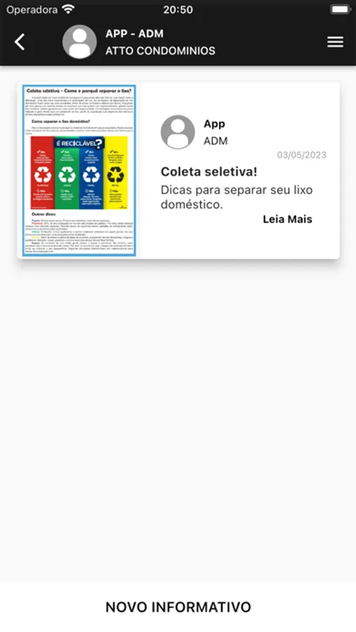 Podem também ser disponibilizado documentos como regimento interno, convenção coletiva e atas de reunião. Todos os usuários receberão notificações avisando do novo informativo. O aplicativo informa ao administrador os moradores que já leram ou não o informativo.