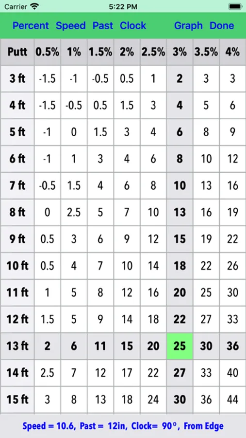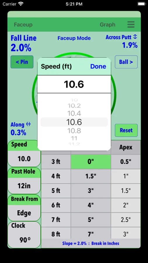 Standard style Break Tables are also available in the menu, that can be adjusted for green speed, past hole distance and clock angle. The app then provides graphical overviews of selected putts with optional configurations.
