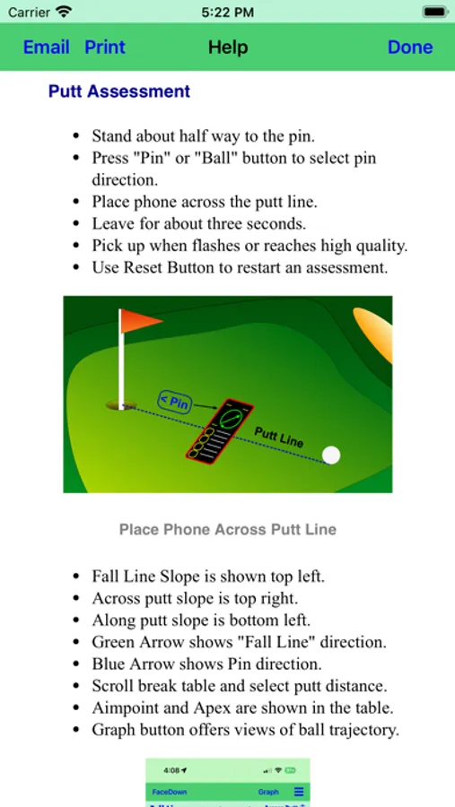 Using the internal iPhone and iPad motion sensors to assess the device orientation and attitude, the App measures slope across and along the line of the putt. The estimated Fall Line direction and slope are then used to predict the likely break.