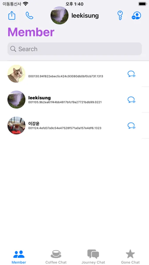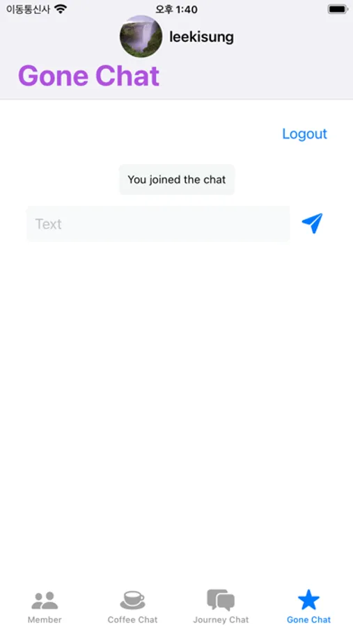 5. Gone Chat : 대화는 기록되지 않으며 로그아웃하거나 앱종료시 내용을 볼 수 없습니다.
