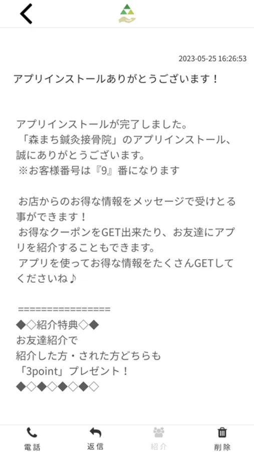 森の鍼灸接骨のアプリをSNSを通じてお友達に紹介する事ができます。
