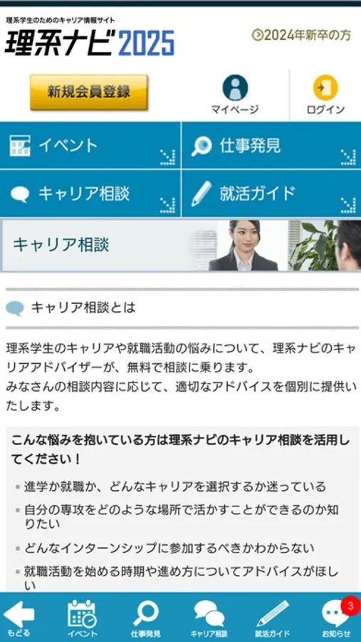 キャリアや就職活動全般についての疑問や悩みがあれば、理系ナビのキャリアアドバイザーがお答えします。