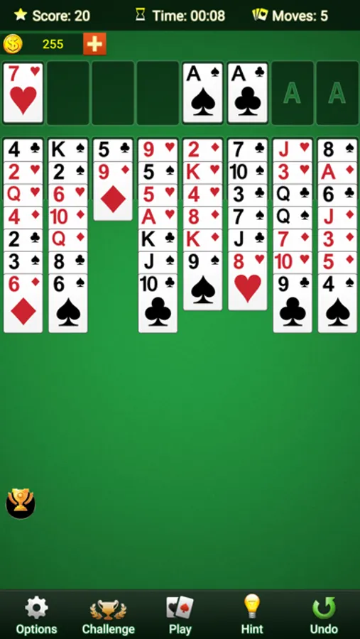 The game begins with eight columns of cards, some face up and some face down. The player must move the cards in descending order and opposite colors (e.g., a black 6 can be played onto a red 7) within the columns. Cards can be moved to the free cells if available to provide more opportunities for strategic maneuvering. The goal is to move all cards to the top four foundation stacks in ascending order, one suit at a time.