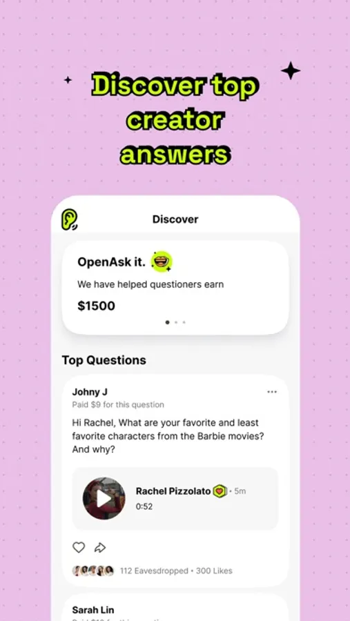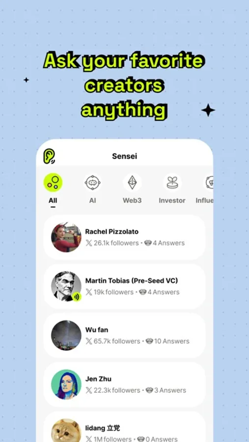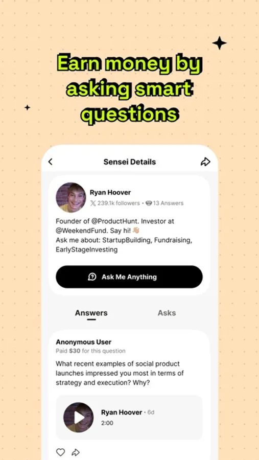 OpenAsk is a voice-based Q&A platform that connects creators to their fans. It introduces a novel model of the creator economy that mutually benefits both creators and followers. Everyone can submit questions directly to sensei, who respond with real-voice answers. Any questions that prove insightful or helpful tend to generate "interest" over time. Questions can make money for you on OpenAsk.