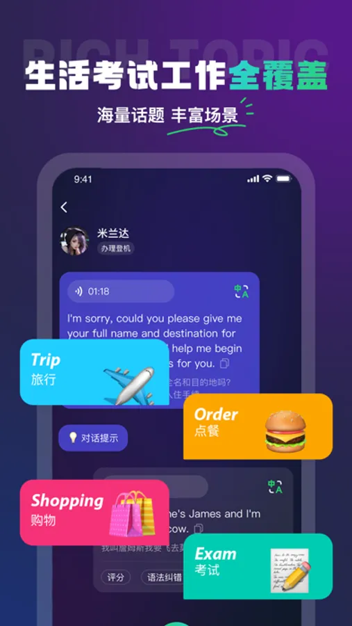 全面覆盖生活、考试和工作场景,提供海量话题和丰富场景,让你的英语面面俱到。你可以选择饭店、机场、超市、酒店等多个场景来进行沉浸式练习,感受真实情景的语言交流。
