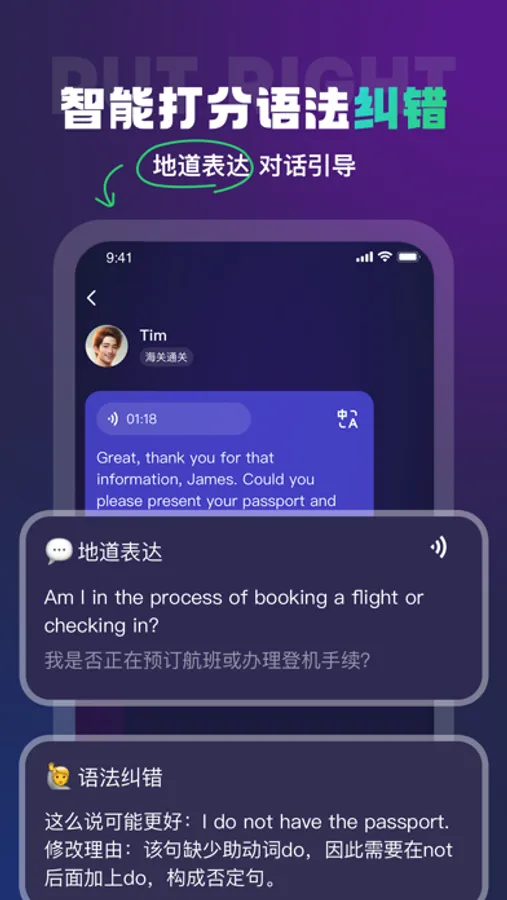 通过智能语音识别技术,进行实时的语音评测和纠错,并针对口语进行打分,让你在日常生活对话和面试工作中能够更流畅的表达自己。