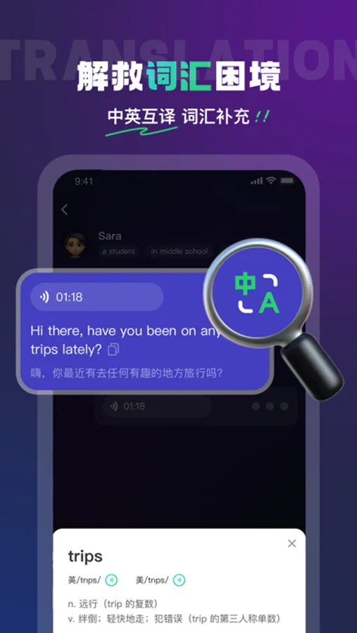 如果你遇到单词或句子不知道如何表达,我们会为你提供精准的中英文翻译以及相应的词汇学习,让你的词汇量得到升级。