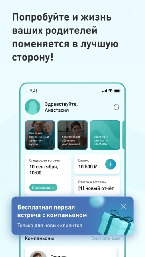 МАМАОК — это уникальный для России сервис по подбору компаньона для пожилых родителей. При помощи приложения можно быстро и удобно подобрать подходящего компаньона, выбрать дату и время визита, оплатить его, и после окончания получить фото- и видео-отчет.