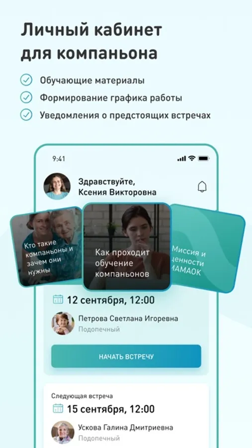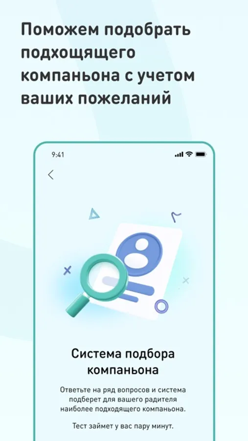 Компаньон — это не сиделка и не патронажный работник. Это спутник и временный друг для пожилых родителей, задача которого — пообщаться на интересную подопечному тему, организовать для него увлекательный досуг (поход в кино, театр, музей, на выставку) и сопроводить в походе по нужным местам (в поликлинику, к зубному врачу) или на прогулке.