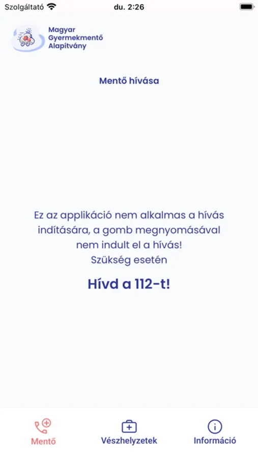 Az Applikációban található Mentő gomb nem hívja ténylegesen a mentőket, csupán a telefonszám megjelenítésére szolgál.