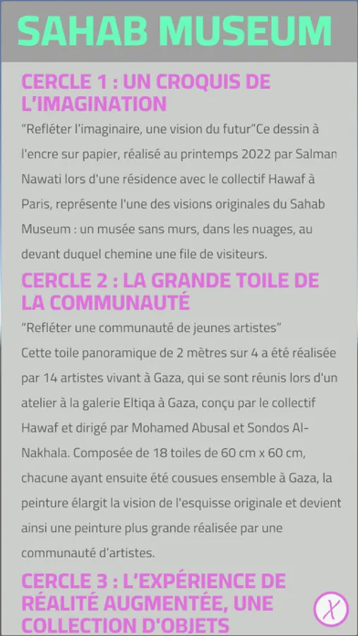 A travers une application de réalité augmentée spécialement développée pour cette exposition, le visiteur est amené à chercher dans le nuage, pour trouver une collection d'objets donnés au Sahab Museum par les artistes participant à l'atelier, ainsi que des informations sur la communauté et les pratiques individuelles des artistes impliqués. Certaines œuvres d'art réalisées par les artistes gazaouis, ainsi que des objets du quotidien, apparaissent dans le nuage et constituent la collection du Sahab Museum.