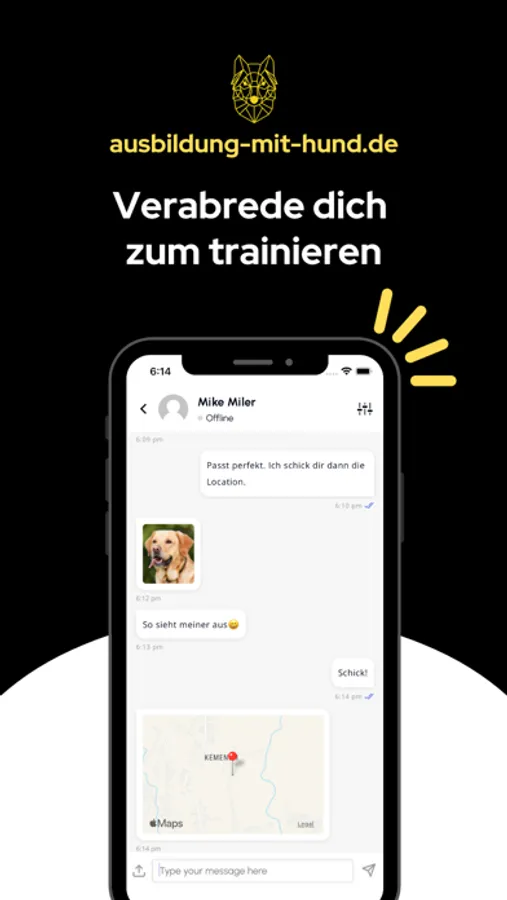 Dein umfassender Chat mit Kursteilnehmern bei ausbildung-mit-hund.de. Du hast kompletten Zugriff auf deine Chats und Gruppen. Triff dich mit anderen zu Übungen und teile deinen Standort, damit ihr euch schneller findet.