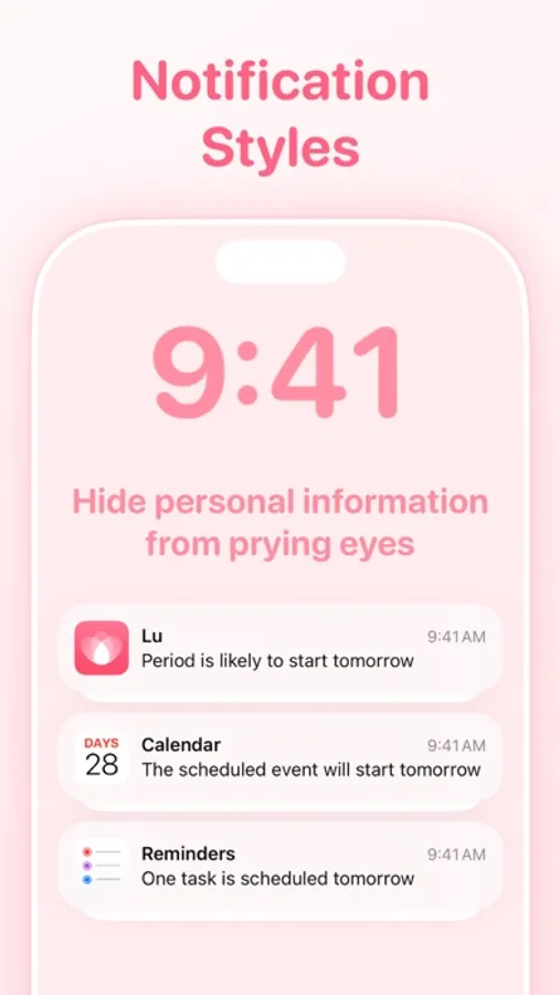 - Receive reminders for your upcoming menstrual period and customize app icon and notifications style for privacy.