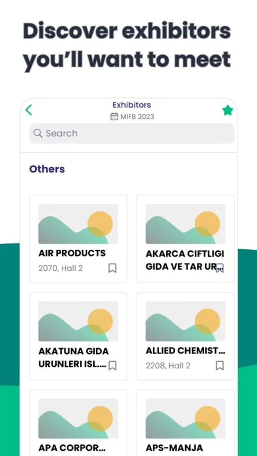 • Exhibitor Information: Browse all the exhibitors participating in the event along with their booth numbers, product information, and contact details. You can also bookmark or favourite specific exhibitors for easy reference.