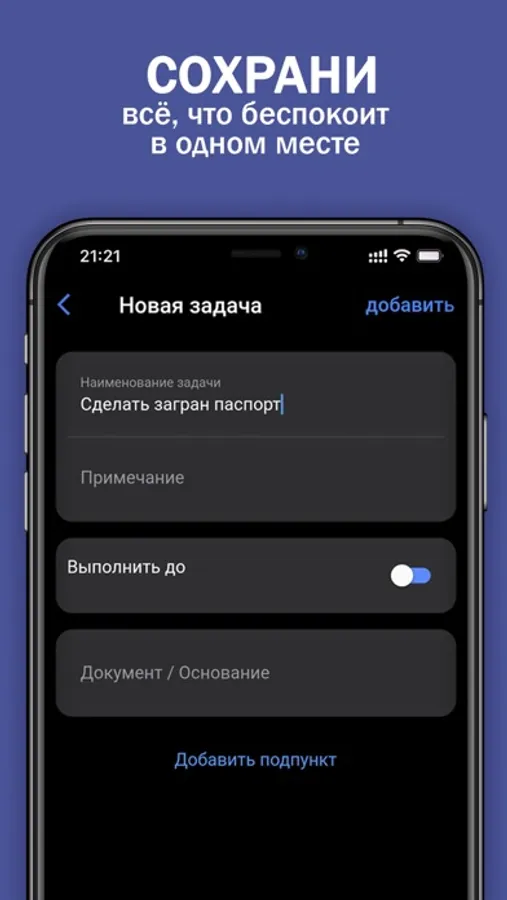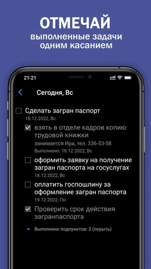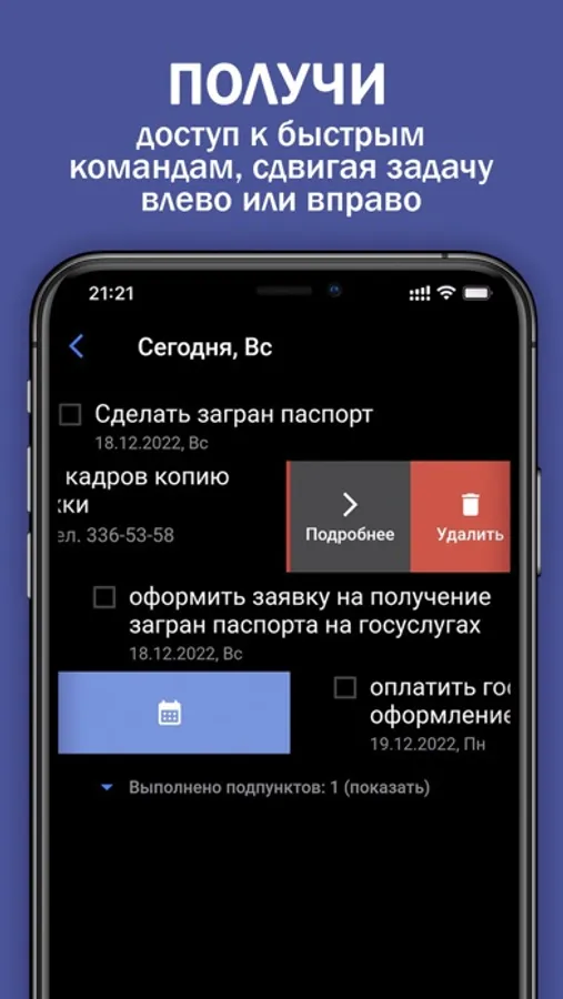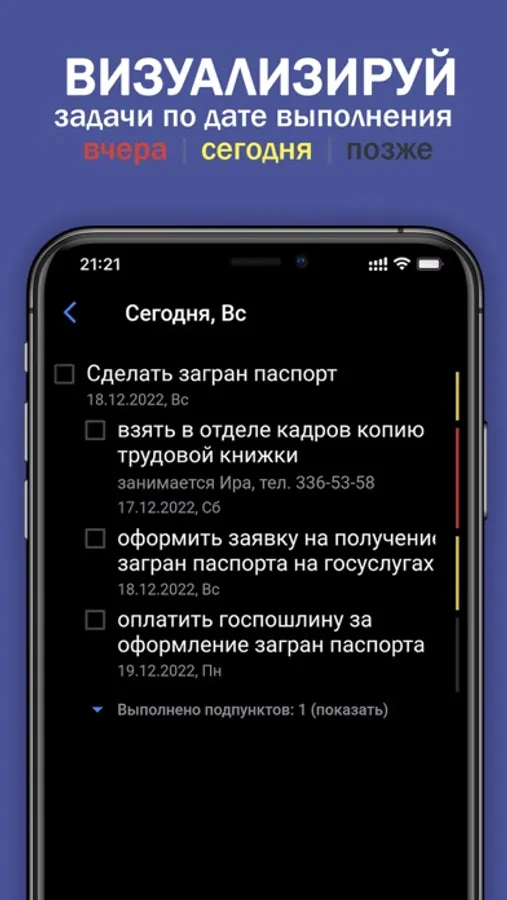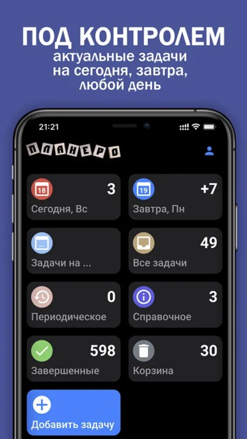 - Контролировать актуальные задачи на сегодня, завтра, любой день.