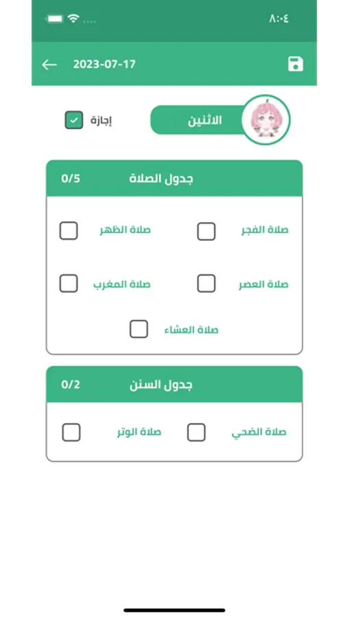 في قسم الصلاة يظهر لك جدول به الفرائض فقط إن لم تكن ملتزما بها ، وفي حال كنت ملتزما يتيح لك التطبيق إضافة الفوائت من الصلوات أو السنن بما يناسبك.