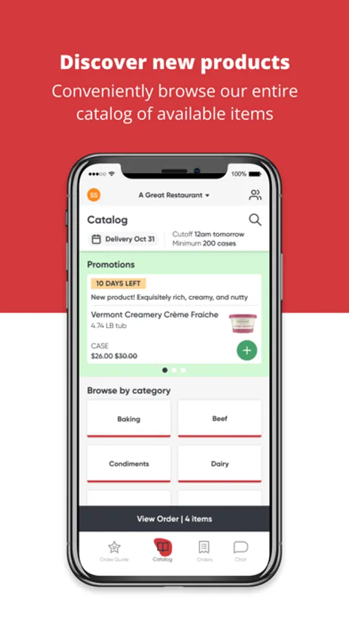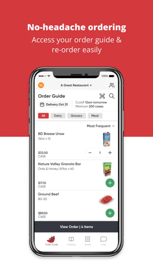 Our mobile app lets you search our complete product catalog, manage and update your ordering guide, and buy what you need at the moment you need it. It’s part of our commitment to giving you an ordering experience you’ll love.