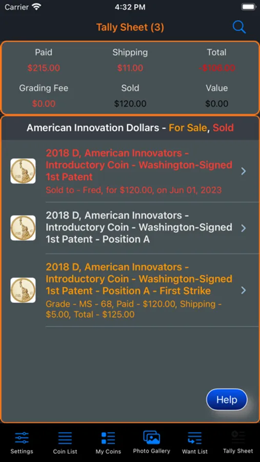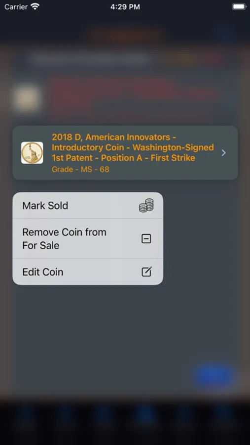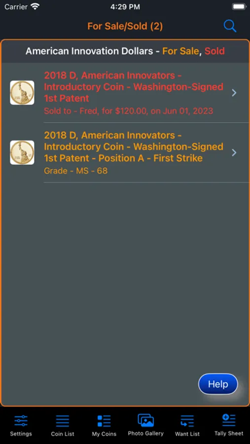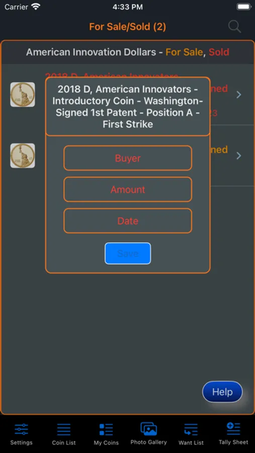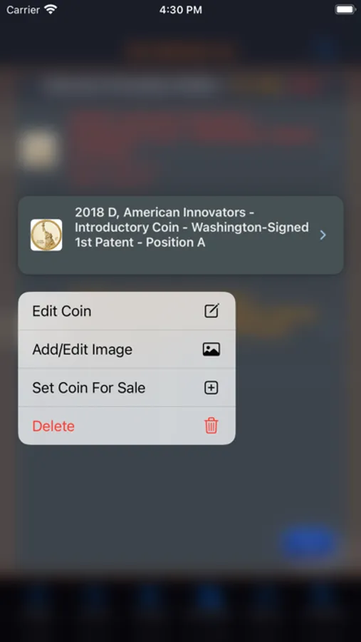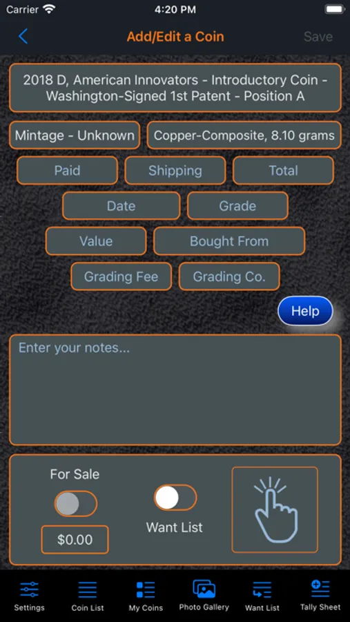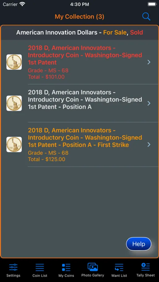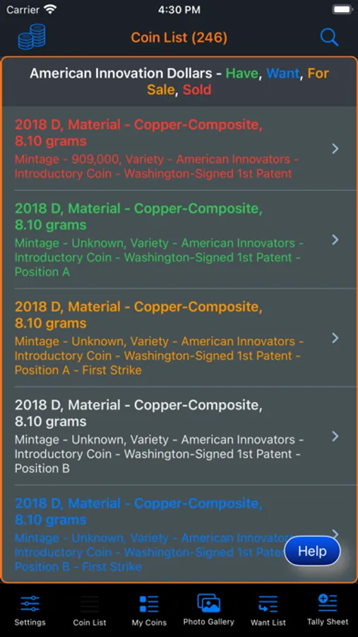 This app will provide the ability for the user to organize, track and manage their collection of coins. Images of each coin can be included with the collection. There is also a means within the app for the user to peruse all of the images in an entertaining manner. The app has three (3) color themes which help to make the app more enjoyable. A running tally of the cost for the entire collection is provided. A want list is also included in the app to allow you to ear-mark coins that you are searching for.