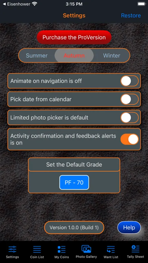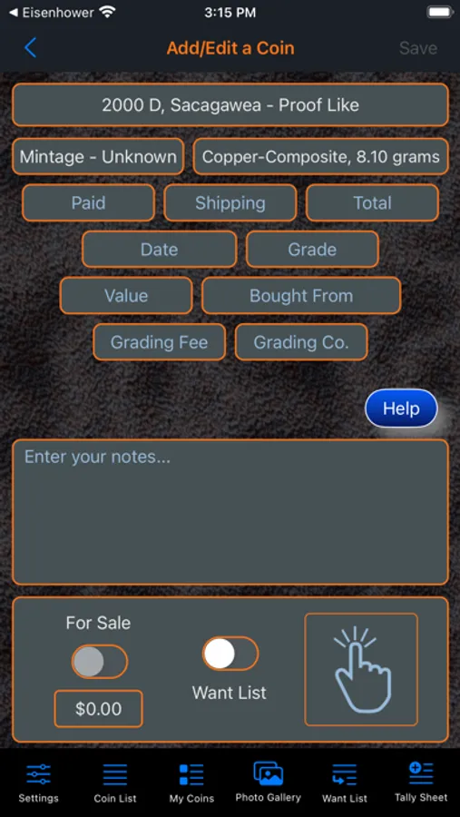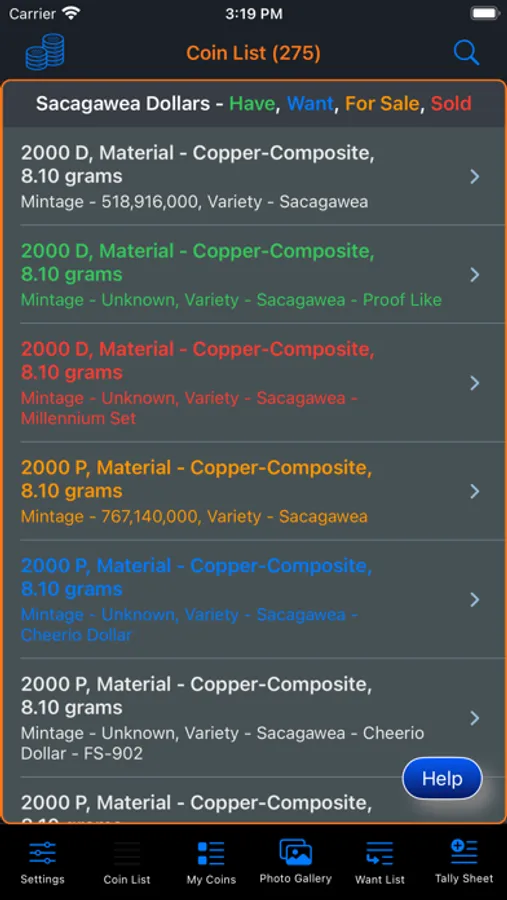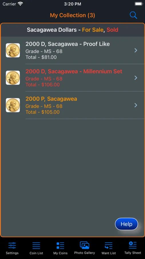 This app will provide the ability for the user to organize, track and manage their collection of coins. Images of each coin can be included with the collection. There is also a means within the app for the user to peruse all of the images in an entertaining manner. The app has three (3) color themes which help to make the app more enjoyable. A running tally of the cost for the entire collection is provided. A want list is also included in the app to allow you to ear-mark coins that you are searching for.
