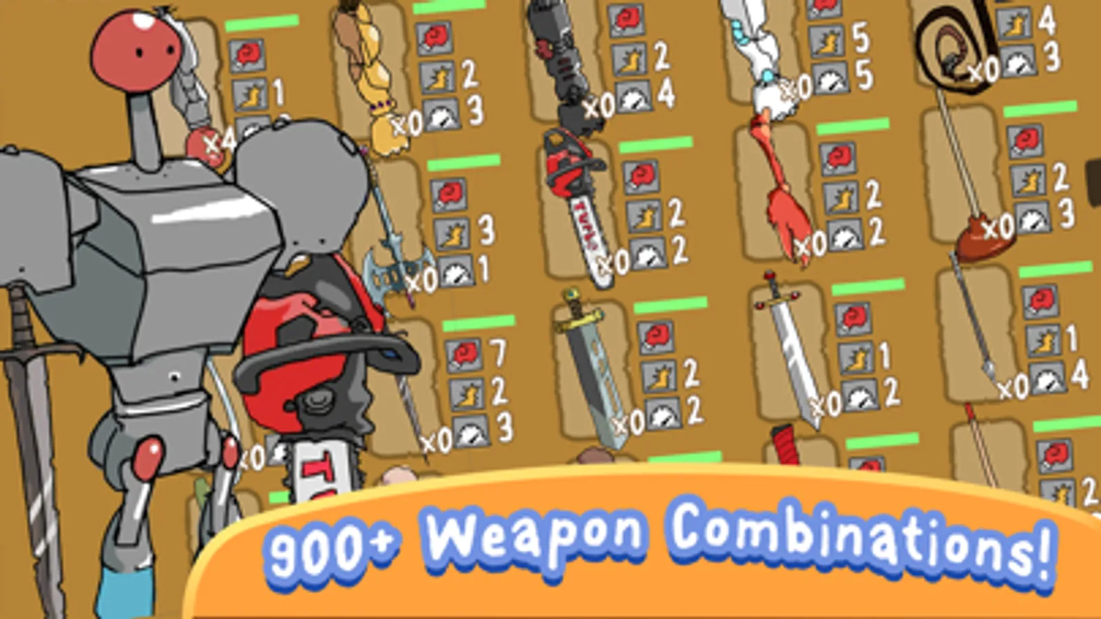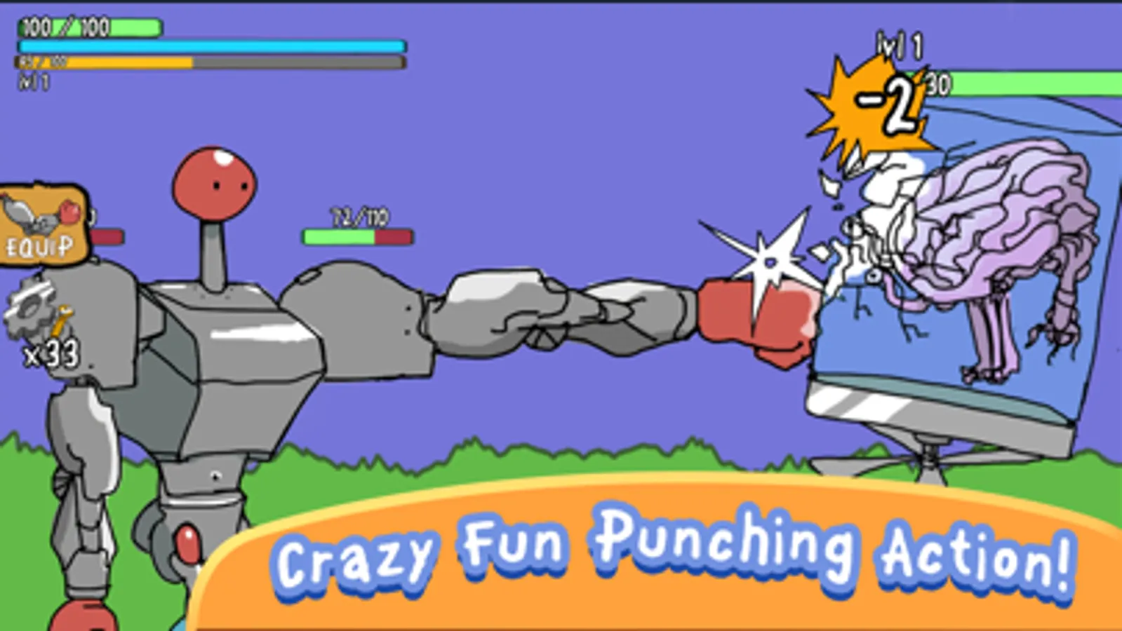 Punch through hordes of wacky enemies! Collect weapons and level up all your stats to build the ultimate robo!