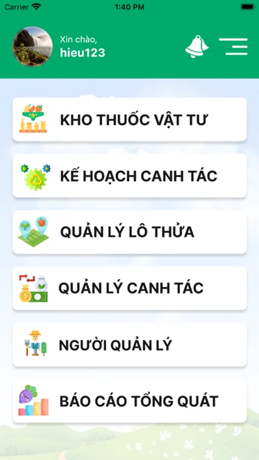 Ứng dụng phục vụ cho bà con nông dân: quản lý canh tác cây trồng đúng mùa vụ và xem các báo cáo về vật tư, lô thửa được sử dụng trong các kế hoạch, mùa vụ cụ thể.