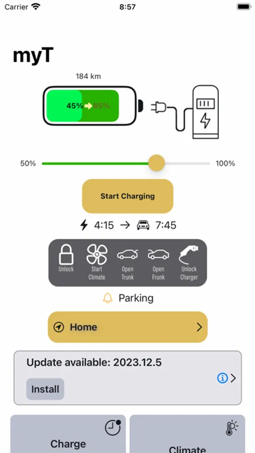 You can get alerts for various conditions like low tire pressure, charging reminders, service reminders and more, per your configuration. The app also lets you control the vehicle, like opening the trunk or frunk or enabling sentry mode and these are integrated with Siri to enable voice commands. The app also includes a watch app that lets you control the vehicle and see its status with complications for quick glances.