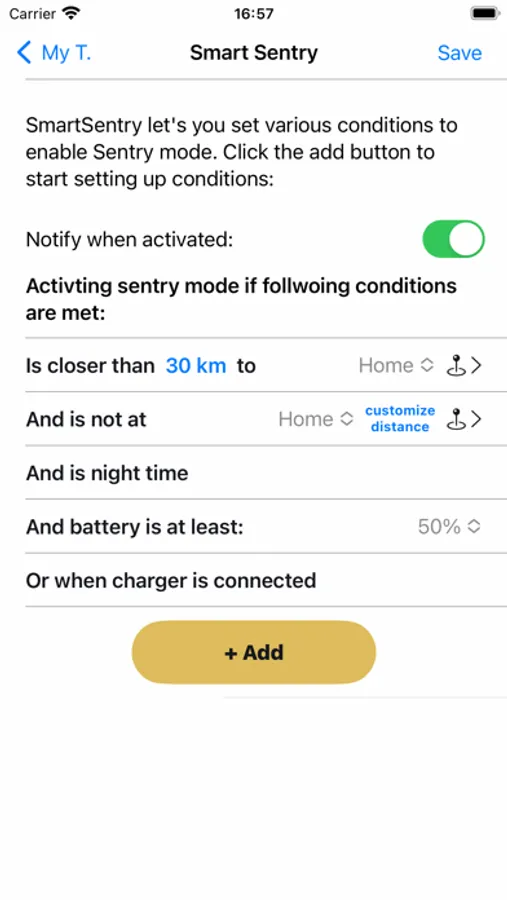Smart sentry lets you activate sentry more with smart rules, like only if battery level is above a certain level, or only at night time.