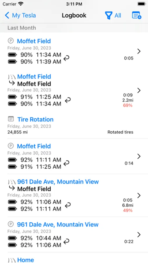 myT will analyze your Tesla and provide you detailed trip reports and activity reports and statistics and analytics on the vehicle performance, like battery health, driving efficiency, phantom power analysis and your driving habits. The app also analysis your phantom power loss and their causes. Maintain a logbook of your vehicle activities, including drives, charges and parkings as well as notes on special events like various service calls such as tire rotation.