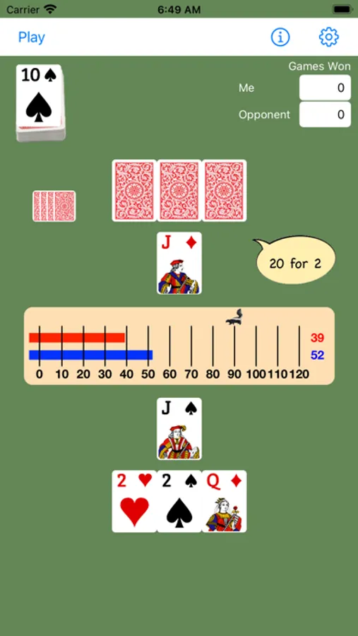 Just Cribbage is dedicated to a true representation of the classic game of Cribbage. You play against one AI opponent, according to rules of the American Cribbage Congress. After each deal, strategically choose two cards from your hand for the Crib. Then compare your skill in pegging against the AI opponent. Player hands and the Crib are automatically counted after all cards are played.
